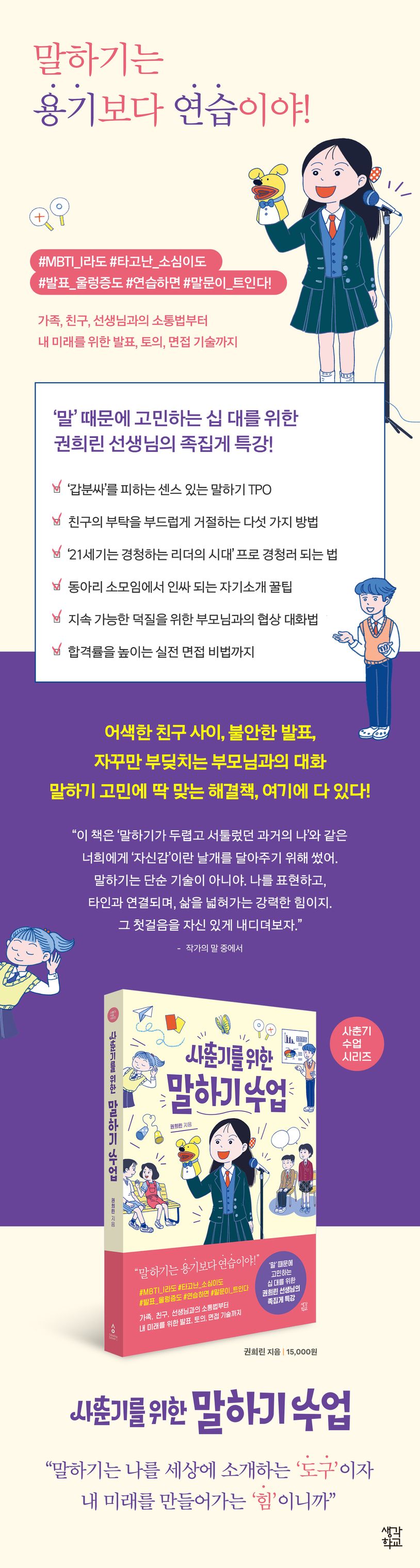 《사춘기를 위한 문해력 수업》, 《사춘기를 위한 맞춤법 수업》을 통해 청소년들의 언어생활에 꾸준한 관심과 열정을 보여온 권희린 사서교사가 신간 《사춘기를 위한 말하기 수업》으로 돌아왔다! 말 한마디에 울고 웃는 청소년들을 17년간 교육 현장에서 지켜봐 온 저자는, 가족과의 대화 중심이던 시기를 지나 스스로 의사를 표현하고 사회적 관계를 형성해 나가야 하는 청소년기를 ‘말하기 성장의 황금기’라고 말한다. 이 책 《사춘기를 위한 말하기 수업》은 말하기의 황금기에 접어든 청소년들이 ‘말’을 통해 관계를 바꾸고, 자신감을 회복하며, 세상과 연결되는 힘을 기를 수 있도록 안내하는 책이다. 듣기 태도부터 말투, 말 습관 같은 일상의 언어 사용을 돌아보고, 이를 바탕으로 말하기가 나의 관계와 미래에 어떤 영향을 미치는지 구체적으로 보여준다.