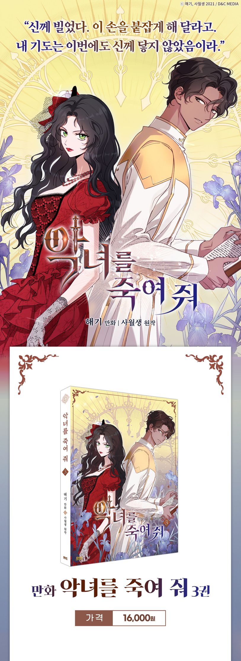 3,500만 카카오페이지 독자를 사로잡은 작품, 「악녀를 죽여 줘」 단행본 3권이 출간되었다.「악녀를 죽여 줘」는 그간 답습되어 온 로맨스판타지의 수많은 클리셰를 깨부순 작품으로, 악녀 에리스에 빙의 한 ‘나’의 처절한 이세계 탈출기를 담고 있다. 자신을 벗어나지 못하게 하는 ‘인과율’의 정체를 파헤치기 위해 아나킨과 함께 보니태오로 떠나는 에리스. 그곳에서 에리스는 메테우스 신관에게 인과율에 얽힌 끔찍한 진실을 듣게 된다. 인과율에서 벗어날 수 없음을 받아들인 에리스를 기다리는 것은 세계가 정한 법칙에 따라 제 손으로 직접 헬레나를 죽이는 일. 과연 에리스는 운명에 따라 헬레나를 죽이고 원래의 세계로 돌아갈 수 있을까? 3권에서 확인하시길.
