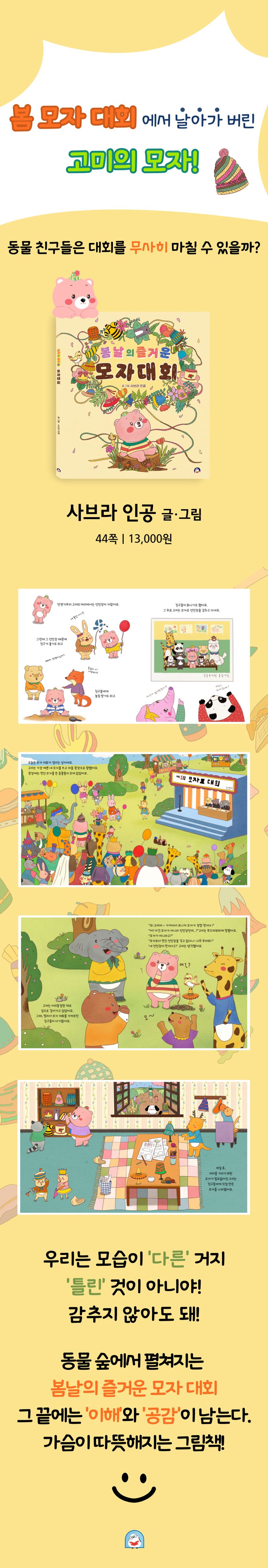 우리 아이들은 남들에게 보이고 싶지 않은 모습이 있다. 특히, 남들과 다른 모습이 있다면 그 모습을 창피해하며 숨기도 한다. 이 책은 주변과 가까워지는 어린이들에게 우리는 모두는 조금씩 다름을, 그리고 다름이 틀림을 뜻하지는 않음을 알려준다. 숨기고 싶던 모습이 누군가에는 멋지고 이쁠 수도 있고, 부러움의 대상일 수도 있다. 두 아이의 엄마이자 작가가 그린 이야기로, 꽃을 피운 선인장에서 향기가 가득해지듯이, 아이들의 마음 속에도 자신감이 가득 채워지기를 바라는 마음을 〈봄날의 즐거운 모자 대회〉에 담아내었다.