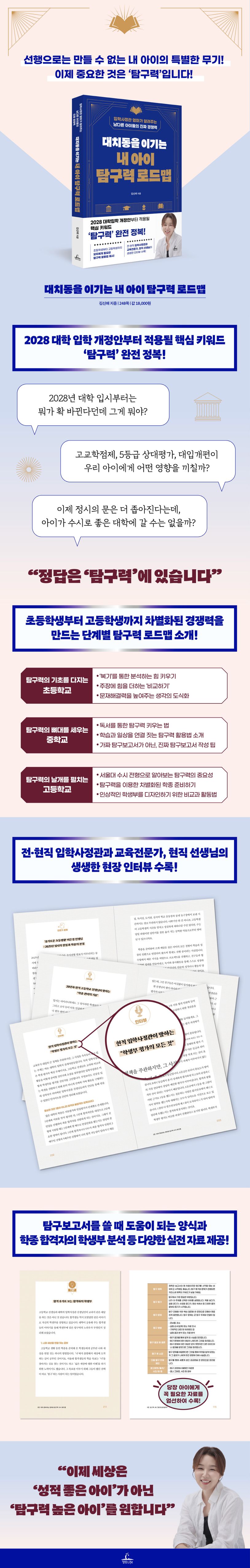 ★‘슬기로운초등생활’이은경선생님강력추천!2028대학입학개정안부터적용될핵심키워드'탐구력'완전정복!다가올2028학년도대학입시는지금까지의입시와는전혀다른패러다임을보여준다.단순한지식암기와문제풀이중심의공부만으로는합격을보장할수없다.대학들은이미여러차례발표를통해“앞으로는융합적사고력과창의적문제해결능력을갖춘인재를선발하겠다”고강조해왔다.이는곧교과성적만으로는더이상경쟁력을확보하기어렵다는뜻이다.대학의눈길을끄는학생은,스스로질문을만들고답을찾아가는과정을통해학습의깊이를보여주는아이들이다.《대치동을이기는내아이탐구력로드맵》은이렇게대학이원하는탐구력을어떻게어릴때부터키워줄수있을까에대한고민에서시작된책이다.저자는대학입학사정관과대치동에서수시컨설턴트활동하며직접확인한수많은사례를바탕으로,“앞으로의입시에서승패를가르는힘은결국탐구력”이라고말한다.이책은불안한학부모들에게변화된입시환경을정확히짚어주고,자녀교육의새로운기준이될탐구력을어떻게길러야할지에대한명쾌한해답을제시한다.초등학생부터고등학생까지차별화된입시경쟁력을만드는단계별탐구력활용법제시!탐구력은하루아침에길러지지않는다.초등학교시절부터차근차근쌓아올려야고등학교에이르러빛을발할수있다.《대치동을이기는내아이탐구력로드맵》은아이의성장단계를고려해초·중·고탐구력로드맵을체계적으로제시한다.초등학교시절에는‘복기하기,비교하기,생각도식화하기’와같은훈련을통해기초탐구력을키우고,중학교시절에는독서를중심으로탐구의뼈대를세우며‘진짜탐구보고서’를작성하는방법을배운다.고등학교시절에는학생부에인상적으로남을수있는비교과활동과프로젝트수행을통해탐구력을입시에직접연결한다.이러한과정은부모가가정에서충분히실천할수있도록구성되어있어,‘탐구력은키우기어렵다’는한계를극복할수있다.단순히공부법을나열하는것이아니라,부모와아이가함께성장하며실천할수있는방법을담아냈다는점에서차별성을지닌다.이책은결국초등부터고등까지이어지는긴여정속에서아이가자기주도적학습자로성장할수있도록돕는가장현실적인가이드가될것이다.전·현직입학사정관과교육전문가,현직선생님의인터뷰를통한2028새로운대입과탐구력의상관관계분석!《대치동을이기는내아이탐구력로드맵》의또다른강점은단순한이론서에머물지않고실제현장의목소리를생생하게담아냈다는점이다.대학입학사정관이자대치동에서수시컨설턴트로활동했던저자의경험은물론,20년차현직고등학교교사가들려주는“학종관리의기술”,현직입학사정관이밝히는“학생부평가의모든것”,그리고교육전문가가전하는“초등에서고등까지이어지는탐구력”에관한인터뷰가책에실려있다.이를통해독자는추상적인개념에그치기쉬운‘탐구력’이실제로어떻게길러지고입시에반영되는지구체적이고입체적인그림을얻을수있다.초등시기의탐구는말그대로탐구력의씨앗을심는시기입니다.아이가질문하는습관을들이고,스스로답을찾아가는과정에서사고력과문제해결력을키우죠.이경험은중학교수행평가와고등학교비교과활동으로이어지면서입시에필요한세특(세부능력및특기사항)작성에도직접적인영향을미칩니다.대학에서는단순히암기력이아닌,문제를정의하고해결해나가는과정을평가하기때문에초등학생시절의작은탐구경험들이쌓여큰자산이됩니다._이은경(자녀교육전문가,‘슬기로운초등생활’대표)
