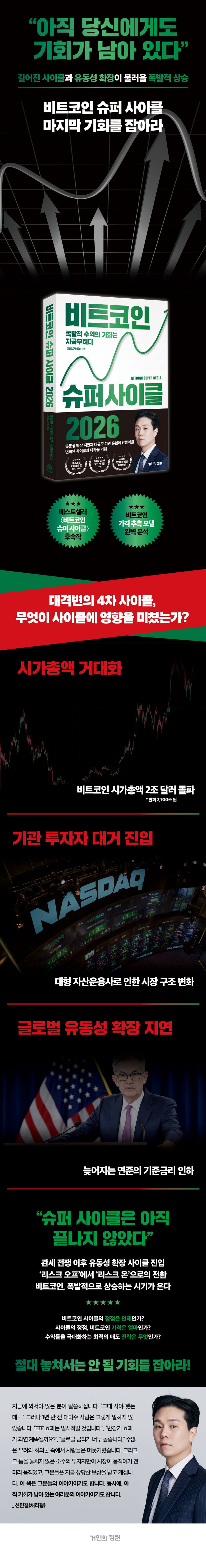 지금에와서야많은사람들이“그때비트코인을샀어야했는데…”라고말한다.그러나4차반감기가되기전,대다수의사람은그렇게말하지않았다.반감기나현물ETF로인한영향력은미미할것이고글로벌금리도높아비트코인은상승여력이없다며회의적으로바라봤다.이책의저자는《비트코인슈퍼사이클》에서다양한근거를들어반감기이후비트코인이폭발적으로상승할것이라예견하였고,결과적으로비트코인은다시한번역사적고점을돌파했다.시장이움직이기전미리움직인소수의투자자들은그대가로달콤한보상을얻었다.그렇다면4차반감기이후1년반이지난2025년중반,더이상의기회는없는것일까?저자는이책,《비트코인슈퍼사이클2026》을통해아직기회가남아있다고단언한다.