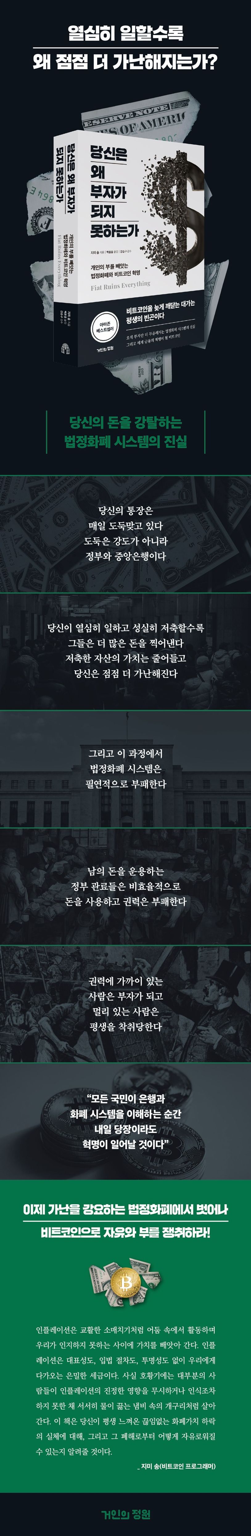 사람들은 부자가 되기 위해 열심히 일하고 저축한다. 그러나 노력한 만큼 보상받고 있다고 생각하는 사람은 거의 없을 것이다. 부동산 가격과 물가는 빠르게 오르고, 저축한 돈의 구매력은 시간이 갈수록 하락한다. 당신은 왜 부자가 되지 못하는 걸까? 단지 노력이 부족해서만은 아니다. 오늘날의 금융 시스템은 처음부터 기득권의 권력을 보호하고 평범한 사람들을 강탈하도록 설계됐다. 내가 가진 자산의 가치는 내가 얼마나 많은 노력과 시간을 투자했는지와는 아무런 관련이 없다. 정부와 중앙은행이 법정화폐를 얼마나 찍어내고, 어떠한 정책을 펼치는지에 따라 결정된다. 이 과정에서 법정화폐는 필연적으로 부패한다. 개인의 돈이 아닌 공공의 돈을, 사익이 아닌 공익을 위해 사용하는 관료들은 효율적으로 자본을 활용하지 않고 정치적 목적에 따라 움직인다. 이 시스템 가까이 있는 사람들은 부조리하게 이득을 취하고 그렇지 못한 사람들은 철저하게 이용당한다. 공익이란 명분으로 발행되는 돈이 실은 이 법정화폐 시스템에서 멀리 떨어져 있는 사람들의 주머니에서 나온다는 사실이야말로 불편한 진실이다. 더 심각한 문제는 법정화폐가 자본의 부패를 넘어 문명을 파괴한다는 사실이다. 이 책은 법정화폐 시스템이 개인을 착취하고, 나아가 사회의 도덕성과 기술의 발전까지 방해하며 문명을 파괴하고 있는 실태를 낱낱이 파헤친다. 그리고 사회를 망치는 법정화폐의 ‘보이지 않는 설계’를 드러내는 한편 세계 금융을 뒤흔들고 있는 비트코인이 법정화폐의 폐해를 무너뜨리는 유일한 해답이 된다는 것을 보여준다.