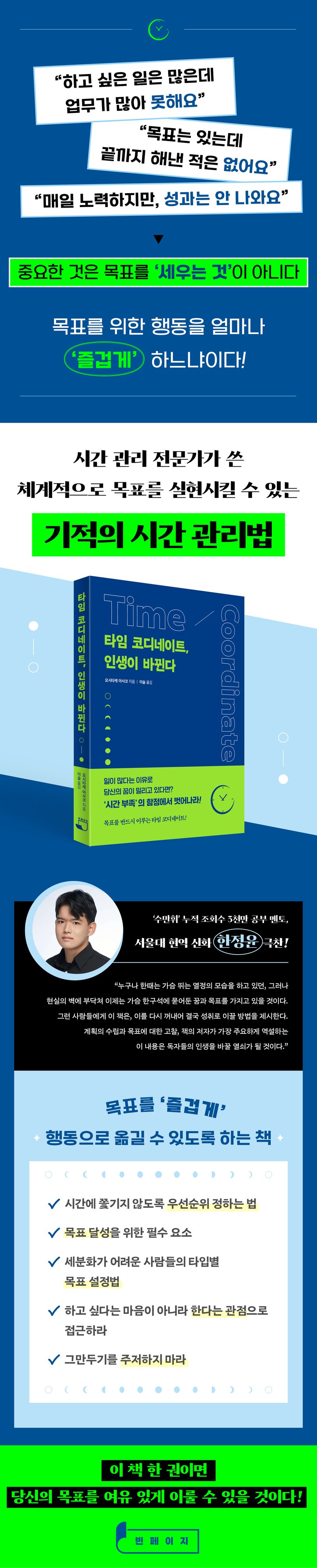『타임 코디네이트, 인생이 바뀐다』는 저자가 개발한 시간 기술 ‘타임 코디네이트’를 통해 계획 세우기부터 목표 달성까지의 과정을 여러 사례로 알기 쉽게 설명한다. 타임 코디네이트가 제시하는 삶의 전략은 우리가 꿈꿨던 미래를 구체화하고 하나씩 성취하는 기쁨을 알려줄 것이다.