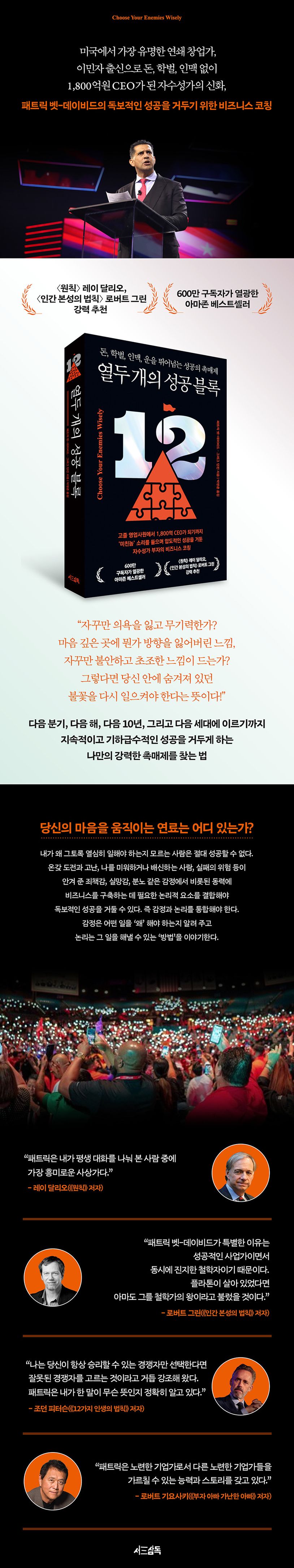 그는이책《열두개의성공블록》에평범한고졸영업사원에서어마어마한성공을거둔CEO가된비밀과성공전략을남김없이풀어놓았다.패트릭은주변의도움없이맨땅에헤딩하듯이루어낸성공이기에‘이렇게어려울때한마디라도조언을건네주는사람이있었으면좋겠다’라는생각을하는초보사업가나리더들의마음을너무나잘알고있다.이런사람들을도와주고싶다는마음에주변사람들을대상으로시작한비즈니스코칭은10년이넘는기간동안이어지면서누구나적용할수있으면서도실제로효과가매우좋은성공전략으로다듬어졌다.실제로그의코칭을통해대학생,경비원,피자가게사장등평범하게사회생활을시작했으나수십만달러를버는성공을거둔사례가다수배출되었다.패트릭은자신의코칭이업계를막론하고수천명의사람들에게효과를발휘하는모습을지켜봐온만큼이책을읽는독자들역시그러한성과를거두기를바라는마음으로책을썼다.