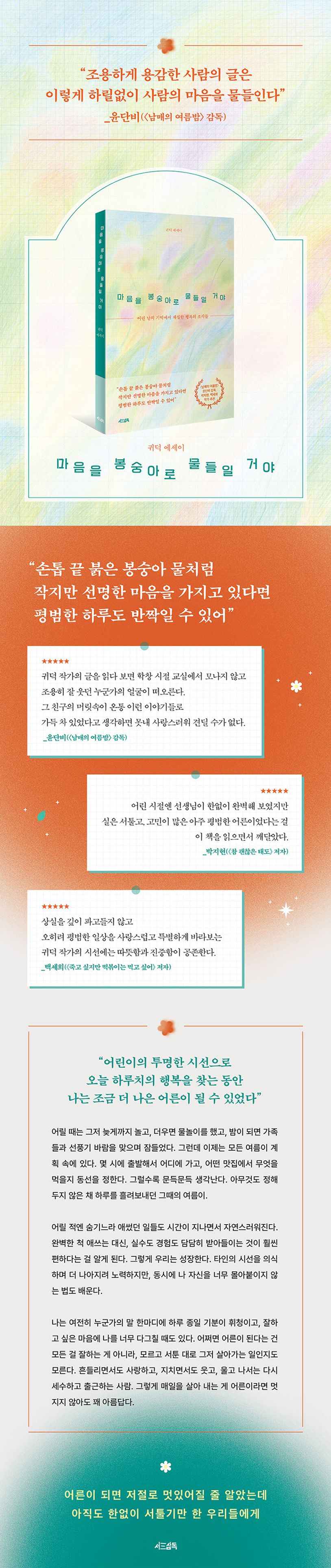 어린이의 투명한 시선으로 찾은 작지만 선명한 행복의 조각들은 어떤 모습일까. 멀리 마음속에 묻혀 있던 기억들을 불러오며 시작하는 이 책은 아이들을 통해 어린 시절을 되돌아보고 스스로를 더 이해하게 된 사람, 세상이 말하는 기준에 맞춰 살았지만 이제는 자신의 목소리를 따라 행복을 찾기로 결심한 사람의 이야기를 담고 있다.