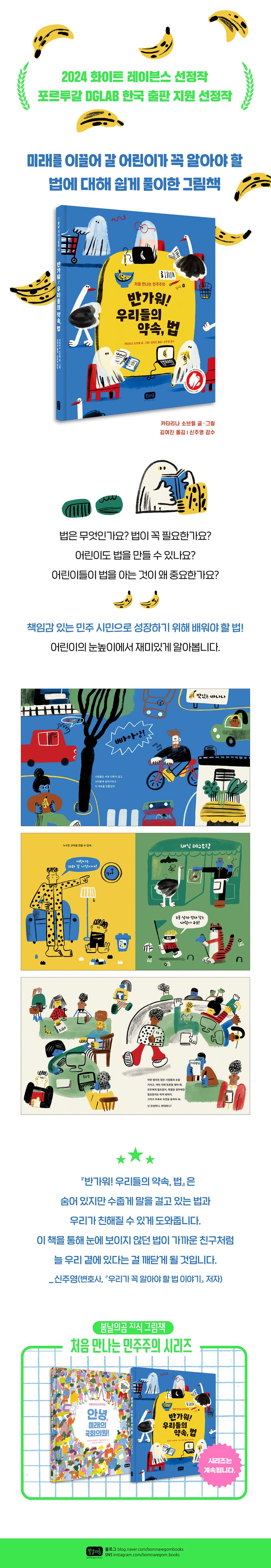 법은 무엇일까요? 법이 꼭 필요할까요? 어린이도 법을 만들 수 있나요? 어린이들이 법을 아는 것이 왜 중요할까요? 법은 눈에 보이지 않아서 자칫 어렵고 멀게 느낄 수 있지만 법은 어린이의 일상에 늘 밀접하게 존재하고 있습니다. 법을 알면 우리가 살고 있는 사회를 이해하고, 어린이가 어떤 권리와 의무를 가지고 있는지 알 수 있습니다. 『반가워! 우리들의 약속, 법』은 어린이가 꼭 알아야 할 법을 쉽고 재미있게 설명한 지식 그림책입니다. 이 책을 통해 눈에 보이지 않던 법이 가까운 친구처럼 늘 우리 곁에 있다는 걸 깨닫고, 어린이들이 책임감 있는 민주 시민으로 성장하는 지혜를 배울 수 있을 것입니다.