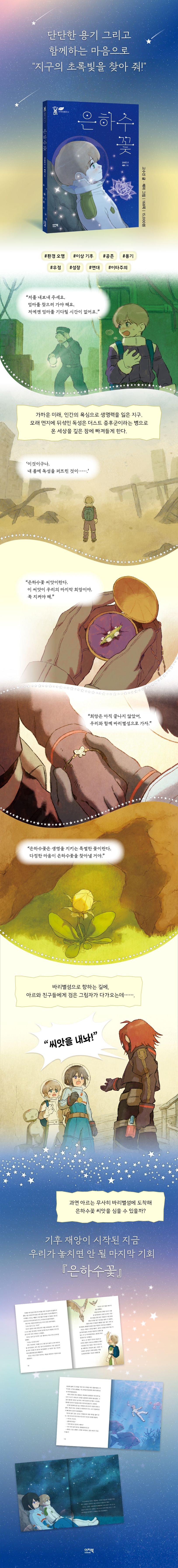 이지북 SFF 환경 과학 동화 시리즈 〈초록별 샤미〉의 열 번째 책 『은하수꽃』이 출간되었다. 가까운 미래, 인간의 욕심으로 생명력을 잃은 지구는 독성 모래 먼지로 가득 찬다. 이 먼지는 사람들을 영원히 잠들게 하는 무시무시한 더스트 증후군을 만들어 낸다. 아르는 지하 도시로 몸을 숨기지만 더스트 증후군은 더 빠른 속도로 퍼져 간다. 병에 걸린 아르를 구하기 위해 하나뿐인 치료제 은하수꽃을 찾아 떠난 엄마. 그런 엄마를 따라 마지막 은하수꽃이 숨겨진 바리별섬으로 향하는 아르. 과연 아르는 엄마와 은하수꽃을 찾을 수 있을까?