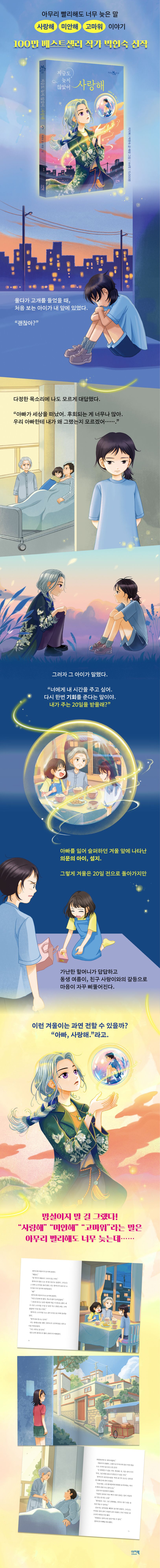 100만 베스트셀러 작가 박현숙이 〈지금도 늦지 않았어〉 시리즈의 신작 세 권을 동시 출간했다. 『지금도 늦지 않았어 사랑해』 『지금도 늦지 않았어 미안해』 『지금도 늦지 않았어 고마워』에는 ‘우리가 미처 전하지 못한 진심’에 관한 슬프고도 아름다운 사연이 담겼다. 인간에게 자신의 시간을 나눠 줘야 저승사자가 되지 않을 수 있는 설지는 각 권에서 겨울, 두빈, 온주를 만난다. 아빠에게, 친구에게, 선생님께 “사랑해” “미안해” “고마워”라고 말하지 못해 후회하는 겨울, 두빈, 온주. 이들은 과연 설지가 주는 20일을 받아 진심을 전할 그날로 돌아갈 수 있을까? 이번에는 망설이지 않고 “사랑해” “미안해” “고마워”를 전할 수 있을까?