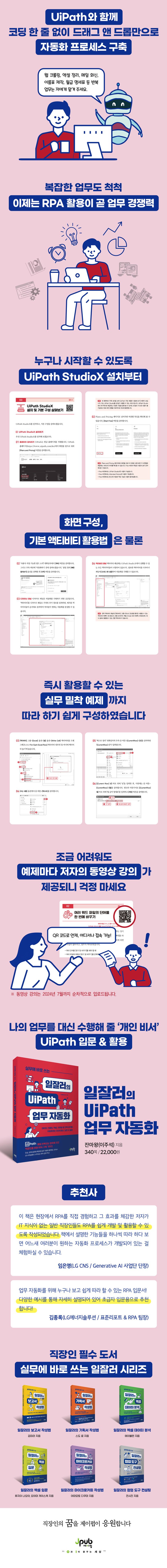 그렇다면 여러분은 ‘내 일의 자동화’를 고민해 보신 적 있으신가요? 사실 자동화라고 하면 ‘코딩’을 떠올리기 마련입니다. 그리고 으레 포기해 버리고 말죠. 하지만 UiPath는 다릅니다. 코딩 한 줄 몰라도 드래그 앤 드롭만으로 웹사이트 크롤링, 엑셀 데이터 정리, 이메일 전송·회신까지 모두 자동화할 수 있습니다. 이 책은 UiPath 입문&활용서로 직장인 누구나 즉시 활용할 수 있는 실무 예제를 담고 있습니다. 예제를 따라 하다 보면, 어느샌가 UiPath가 여러분의 개인 비서로 활약하며 복잡한 반복 업무를 대신 수행해 줄 것입니다.