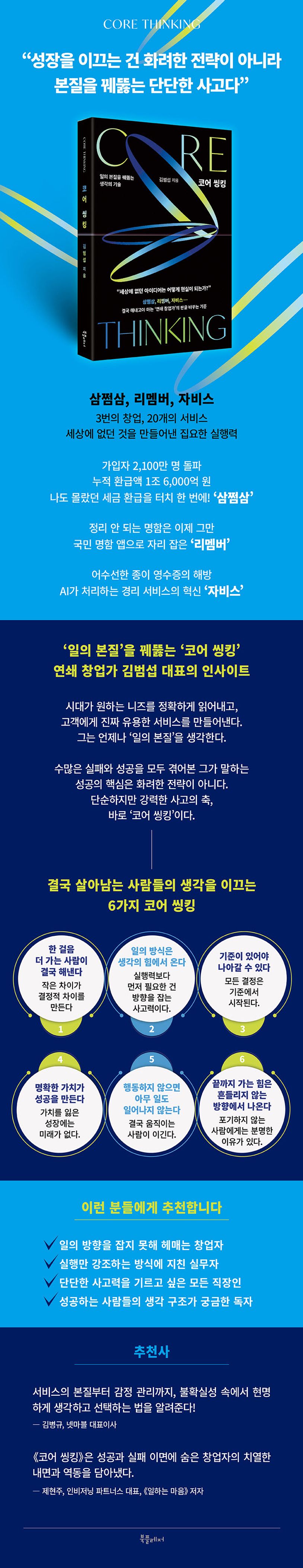 세상을 바꾸는 수많은 서비스는 과연 누가 만드는 것일까. 눈먼 돈을 찾아주는 세금 서비스 ‘삼쩜삼’, 국민 명함 앱 ‘리멤버’, AI가 처리하는 경리 서비스 혁신 ‘자비스’까지. 3번의 창업, 20개 이상의 서비스, 세상에 없던 것을 집요한 실행력으로 만들어낸 김범섭 대표는 수없이 실패하고 좌절했던 순간에도 멈추지 않았다. 《코어 씽킹》은 단순한 창업 매뉴얼이 아니다. 실패와 좌절을 반복하는 과정 속에서 끝까지 버틴 한 사람이 일의 본질과 자신만의 기준을 세워가는 과정을 진솔하게 담아냈다. 기획보다 실행을, 트렌드보다 방향을, 겉보다 중심을 택한 그의 선택들 속에는 성장의 원동력은 결국 마음가짐과 생각의 힘에서 비롯된다는 깨달음이 녹아 있다.