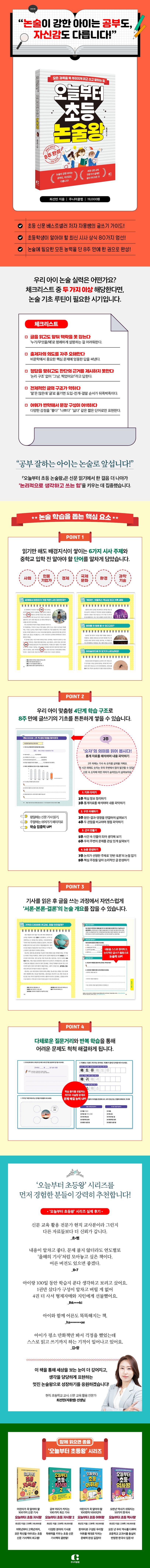 이러한 문제를 해결하기 위해 출간된 『오늘부터 초등 논술왕』은, 모든 과목의 성적을 끌어올리는 ‘언어력의 기본기’를 체계적으로 다져주는 초등 논술 훈련서다. 17년 차 현직 초등학교 교사이자 신문 활용 교육 전문가인 저자가 실제 교실에서 효과를 검증한 방법만을 선별해 담았으며, 하루 10~15분이면 집에서 바로 따라 할 수 있는 실천형 구성이 특징이다. 학원에 의존하지 않고도 하루에 2장씩, 8주 동안 꾸준히 따라 하면 ‘논술 근육’을 충분히 키울 수 있다.