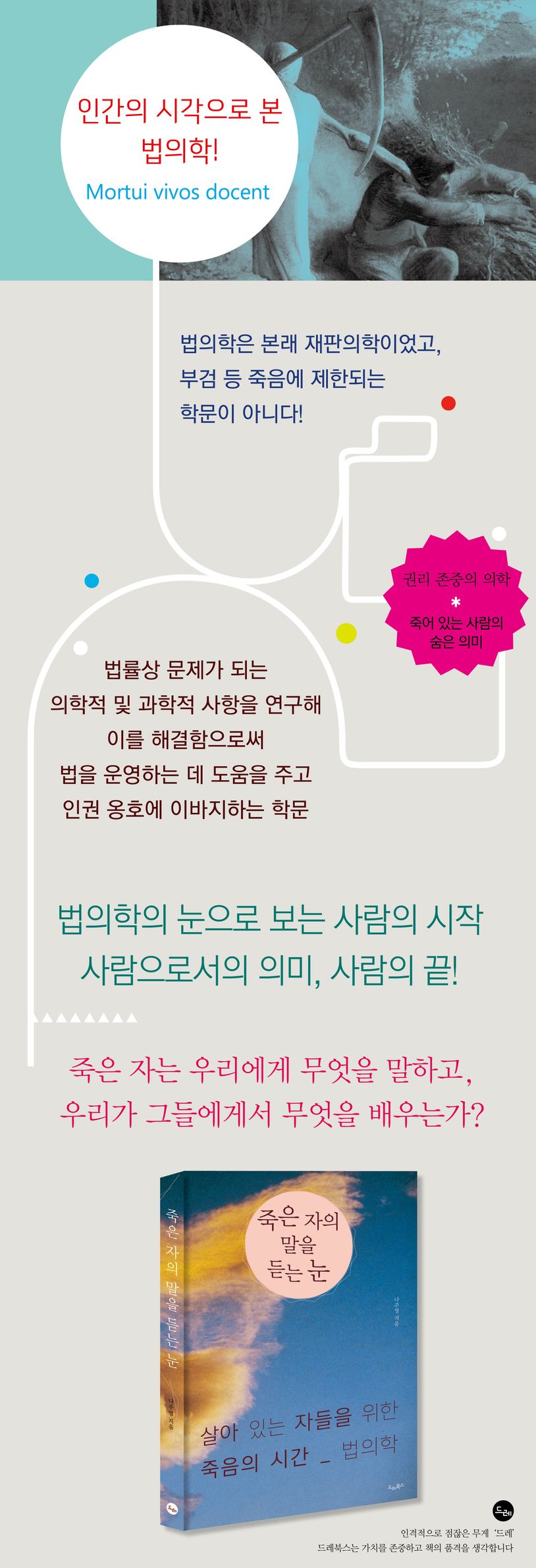 법의학자 나주영 교수의 《죽은 자의 말을 듣는 눈》 개정판을 출간했다. 이 책은 인간의 시각으로 본 법의학을 다루고, 법의학의 시각으로 인간을 바라본다. 죽은 사람이 살아 있는 사람들에게 어떤 말을 하고 있고, 우리가 그들에게 무엇을 어떻게 배울 수 있는지 고민하고 그 숨은 의미를 찾는다. 죽은 자의 말을 듣는 눈으로 삶의 의미를 되짚어본다.