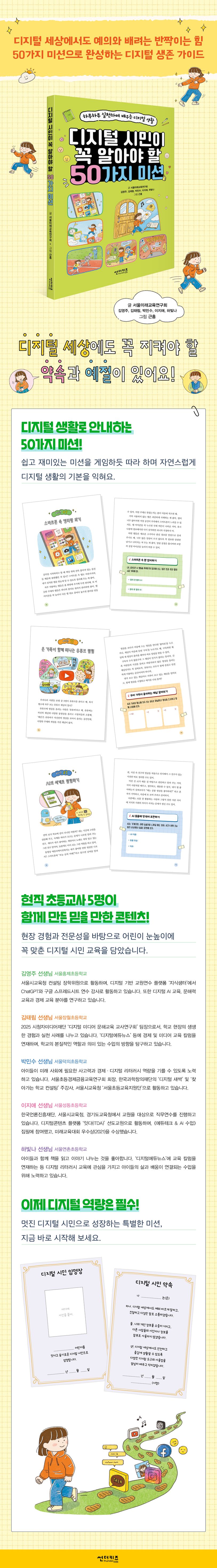 《디지털 시민이 꼭 알아야 할 50가지 미션》은 디지털 공간에서 꼭 지켜야 할 기본예절과 안전 수칙을 어린이들이 스스로 익힐 수 있도록 쉽고 재미있는 미션 중심으로 설명합니다. 디지털 세상과 실제 세상을 비교해 보는 기초 이해부터 시작해, 스마트폰 정리하기, 유튜브 알고리즘 이해하기, AI와 협력하는 기술 익히기, SNS에서 예절 지키기 등 어린이들이 매일 접하는 디지털 환경을 친근하게 소개합니다.