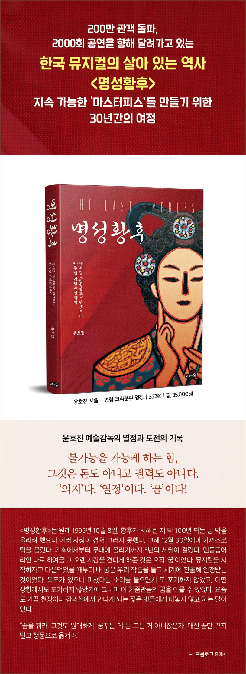 한국 창작 뮤지컬의 선구자 윤호진 예술감독이 〈명성황후〉 30주년 기념공연을 맞아 지난 30년간의 열정과 도전을 담은 자전 에세이 『명성황후』(부제 : 뮤지컬 〈명성황후〉 탄생부터 30주년 기념공연까지)를 내놓았다. 뮤지컬 불모지였던 우리나라에서 숱한 우여곡절을 딛고 1995년 무대에 첫선을 보인 뒤 아시아 최초로 브로드웨이 진출, 영국 웨스트엔드 무대 입성, 200만 관객 돌파 등 수많은 기록을 갈아치우며 한국 뮤지컬의 살아 있는 역사가 된 〈명성황후〉의 모든 것이 담겨 있다.