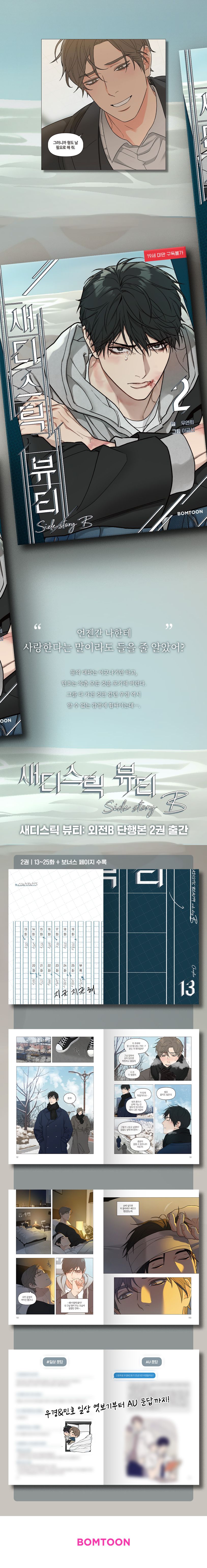 봄툰 대표 하드 BL, 〈새디스틱 뷰티: 외전B〉 12~25화 수록! 우연희 작가가 풀어내는 섬세한 감정선과 이금산 작가의 아찔하고 화려한 작화가 만나, 파국으로 치닫는 두 사람의 관계를 몰입감 있게 그려 낸다.