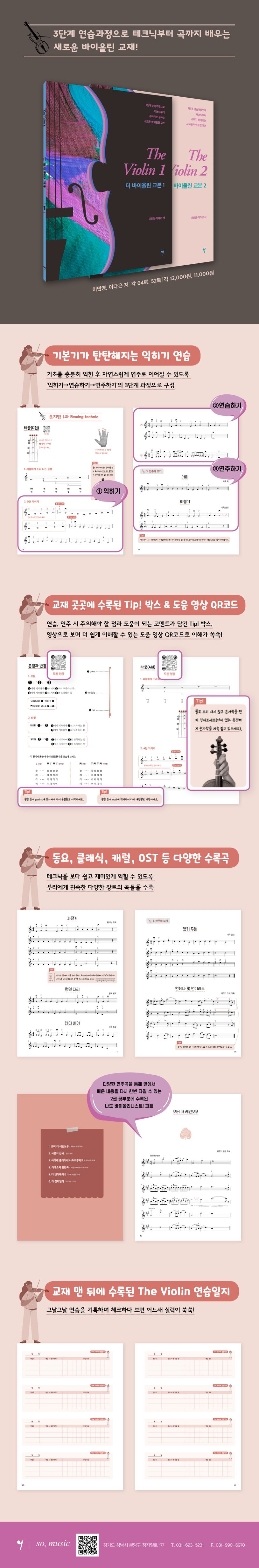 〈더 바이올린 교본〉은 바이올린이 어려운 악기라는 인식을 갖지 않도록, 누구나 쉽게 배울 수 있도록 구성되어 있으며, 다른 교본과 달리 바이올린의 기본기(리듬읽기, 바른 활 쓰기, 소리 내기, 스케일 등)를 탄탄하게 다지는 것을 목표로 합니다. 특히 ‘익히기→연습하기→연주하기’의 3단계 과정을 도입하여 기초를 충분히 익힌 후 자연스럽게 연주로 이어질 수 있도록 구성하였습니다. 한 줄(string)만 배워도 곡을 연주할 수 있도록 되어있어, 손가락 번호에만 의존하거나 곡에서 필요로 하는 운지를 먼저 배워 운지법 때문에 혼란을 겪는 상황을 방지합니다. 또한 곳곳에 연습ㆍ연주 시 주의해야 할 점과 도움이 되는 코멘트가 담긴 [Tip! 박스], 영상으로 보며 더 쉽게 이해할 수 있는 [도움 영상 QR코드]를 수록하여 학습에 도움을 더하였고, 쉽고 재미있게 테크닉을 익힐 수 있도록 친숙한 동요, 클래식, 캐럴, OST 등 다양한 수록곡을 실었습니다. 책 맨 끝부분에는 그날그날 연습을 기록하며 체크할 수 있는 [The Violin 연습일지]까지 알차게 담아냈습니다.