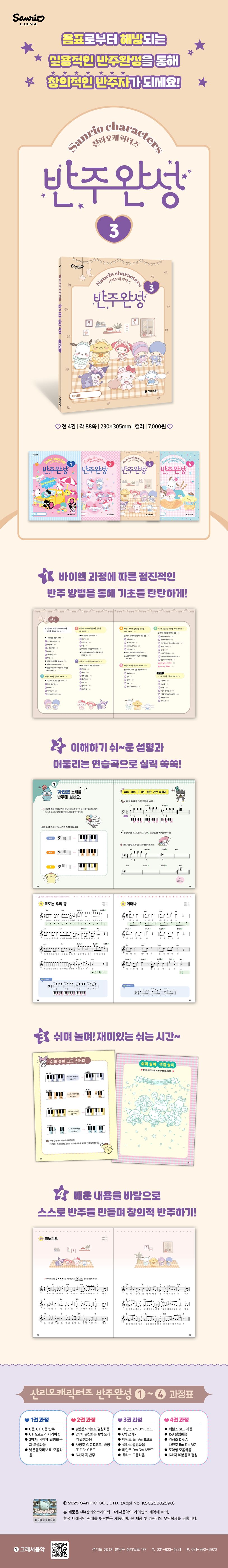 바이엘 15~20번 과정에서 함께 시작할 수 있도록 구성한 즉흥적이고 실용적인 반주 방법을 배우는 반주 교본입니다. 단계별로 총 4권으로 구성되어 있으며, 귀여운 산리오캐릭터즈와 함께하는 쉬운 이론과 반주 패턴 연습으로 곡에 쉽게 적용할 수 있습니다. 짜임새 있는 구성과 다양한 연습곡으로 코드와 반주 패턴을 익히고 스스로 반주를 만들어 적용해보면서 음표로부터 해방되는 반주법을 배울 수 있습니다.