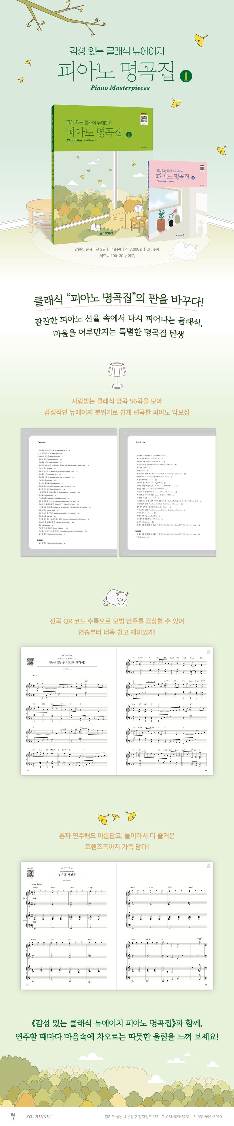 클래식의 위대한 선율들이 뉴에이지의 따뜻하고 서정적인 감성으로 다시 태어났습니다. 〈감성 있는 클래식 뉴에이지 피아노 명곡집〉은 두 권으로 구성, 사랑받아 온 클래식 명곡 56곡을 모아 누구나 쉽고 감성 있게 연주할 수 있도록 힐링과 휴식에 어울리는 뉴에이지 분위기로 편곡했습니다. 차분하고 편안한 선율은 연주하는 이에게는 마음의 위로를, 듣는 이에게는 잔잔한 울림을 선사합니다. 혼자 연주할 수도 있고, 두 명이 함께할 수 있는 4 Hands 곡도 수록되어 있어 친구나 선생님과 함께 음악의 즐거움을 나눌 수 있습니다. 또한 QR 코드를 통해 저자가 직접 연주한 모범 연주를 무료로 감상하며 연습에 도움을 주도록 했습니다. 잔잔한 선율 속에 머무르는 특별한 시간, 이제 클래식 명곡을 뉴에이지 피아노로 만나 보세요.