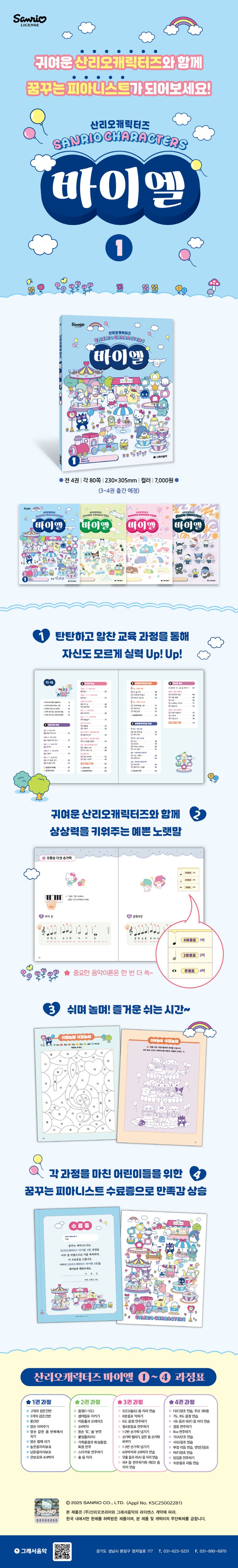 〈산리오캐릭터즈 바이엘 1〉은 피아노를 처음 배우는 아이들을 위한 기초 교본입니다. 각 과정에 맞는 재미있고 다양한 연습곡을 수록하여 기초를 탄탄히 다질 수 있고, 귀여운 산리오캐릭터즈와 함께 학습하는 기초 음악이론, 쉬는 시간, 수료증 등으로 더욱 흥미롭게 학습할 수 있습니다.