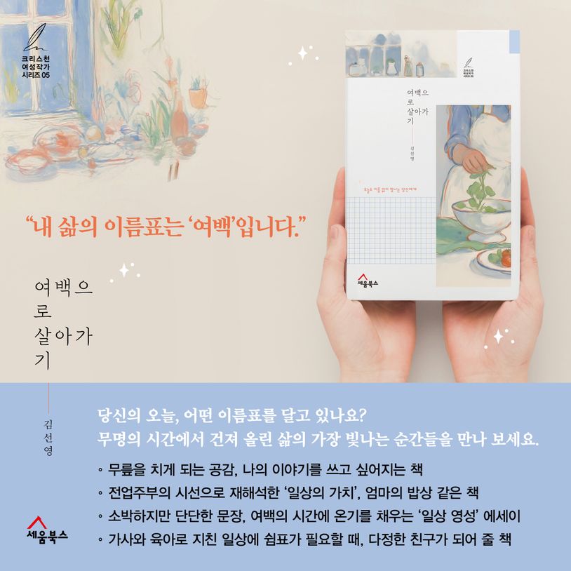 세상 기준으로는 '허수'처럼 여겨질 수 있는 전업주부의 시간. 저자는 이 소중한 시간을 '여백'이라 이름 붙이고, 글쓰기를 통해 그 안에 숨겨진 고유한 가치와 아름다움을 발견한다. 본서는 저자가 무명의 시간, 정성껏 음식을 만들며 누린 기쁨, 자신을 돌아보며 단단해진 순간들, 그리고 일상과 여행 속에서 하나님과 함께한 여정에서 건져 올린 깊은 성찰을 따뜻하고 진솔한 문체로 담아낸 책이다.