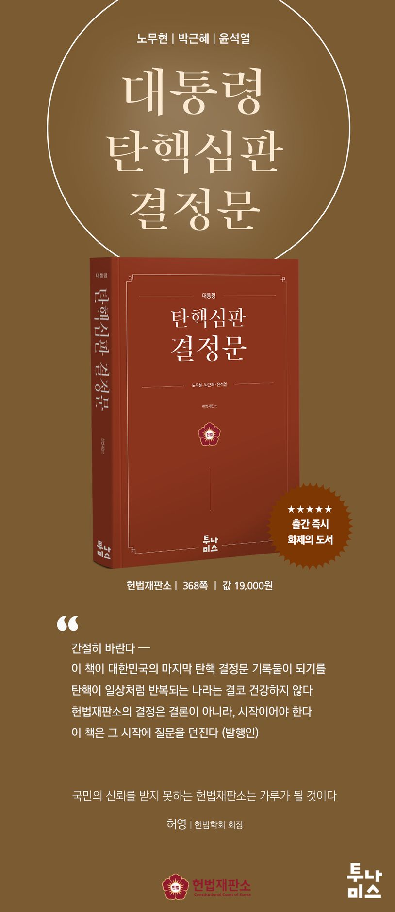 대한민국 헌정사에서 대통령 탄핵심판은 단지 법적 절차를 넘어, 국민의 분노와 절망, 그리고 권력의 민낯이 적나라하게 드러나는 순간이었다. 이 책은 대한민국을 뒤흔든 세 번의 탄핵심판-노무현, 박근혜, 윤석열 대통령 사건의 헌법재판소 결정문 전문을 한자리에 모아, 한국 민주주의의 가장 어두운 장면들을 기록한다.