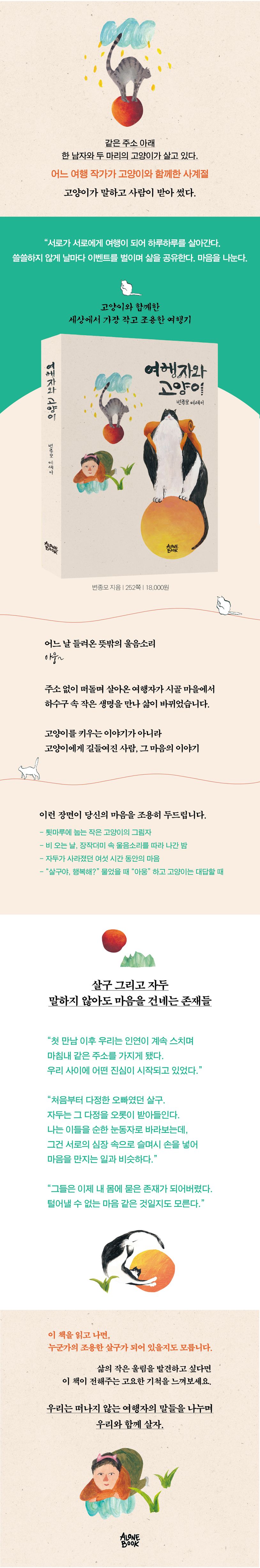 ⟪여행자와 고양이⟫는 여행작가 변종모가 길에서 만난 고양이 ‘살구’와 나중에 찾아온 또 다른 고양이 ‘자두’와 함께 살아가는 이야기를 담았다. 작가는 특유의 섬세한 문장으로 고양이를 만난 이후 변화하는 삶과 감정을 기록했다. 인연을 피하며 살아온 중년의 남자에게 한 생명이 말을 걸고, 그 말에 응답하는 마음의 움직임이 때로는 너무나 애틋하고 때로는 너무나 살갑다.