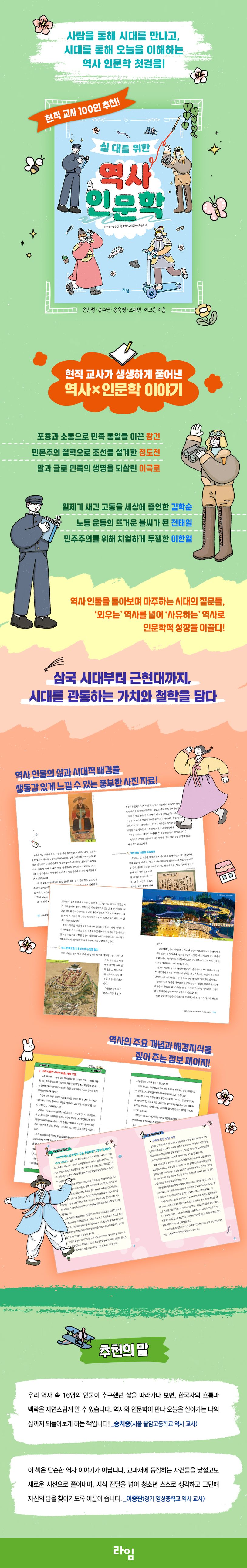 《십 대를 위한 역사 인문학》은 삼국 통일의 기틀을 세운 장군부터 위기에 맞선 조선의 지식인, 일제 강점기에 목소리를 낸 독립운동가, 그리고 민주주의를 위해 투쟁한 청년까지, 시대를 이끈 16인의 삶을 따라간다. 하지만 단순히 위인을 기념하거나 과거의 사건을 나열하지 않는다. 각 인물의 삶에서 주목하는 것은 ‘어떤 시대에, 어떤 문제 앞에서, 어떤 결정을 내렸는가’ 하는 질문이다. 그것은 곧 오늘을 살아가는 청소년에게도 여전히 유효한 질문을 던진다.