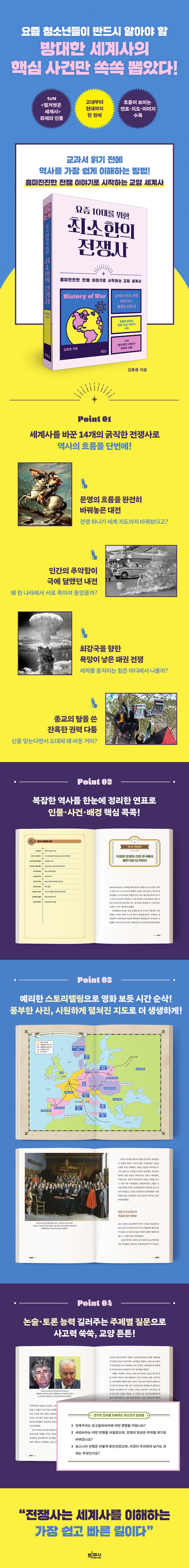 요즘 10대들에게 역사는 ‘교양’보다는 ‘교과 과목’으로 다가온다. 시험을 잘 보기 위해 무작정 외워야 한다고 알고 있는 경우가 많기 때문이다. 역사적 사건을 하나의 이야기보다는 단어나 숫자로 이해하고 넘어가기도 한다. 역사 ‘교과 과목’에 피로감과 부담을 느끼는 10대들에게 쉽고 재미있는 역사 ‘교양’을 전하기 위해 《요즘 10대를 위한 최소한의 전쟁사》가 출간되었다. 이 책은 세계사를 바꾼 14개의 굵직한 전쟁사를 긴장감 넘치는 스토리텔링으로 풀어내 고대부터 현대까지 역사의 흐름을 단번에 잡아준다. 풍부한 연표ㆍ지도ㆍ이미지를 바탕으로 역사의 핵심인 인물ㆍ사건ㆍ배경을 잊지 않게 콕콕 짚어준다.