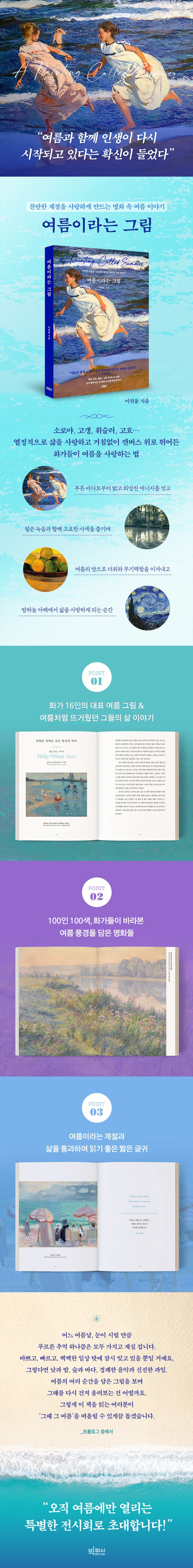 《여름이라는 그림》은 여름을 사랑한 화가 16인의 대표 그림과 함께 100점의 명화를 한 권에 담았다. 이 책을 쓴 이원율 기자는 네이버 기자판 구독자 수 7만 명을 보유한 ‘미술 스토리텔러’로, 화제의 칼럼 〈후암동 미술관〉을 연재 중이다. 그는 소로야의 〈해변 따라 달리기〉를 보고 여름을 가장 좋아했던 자신의 어린 시절을 떠올렸다. 그 기억에서 출발해 하나하나 고른 그림들은 100점 100색의 여름 풍경을 보여주며 우리가 기꺼이 다시 한번 여름을 사랑하도록 만든다.