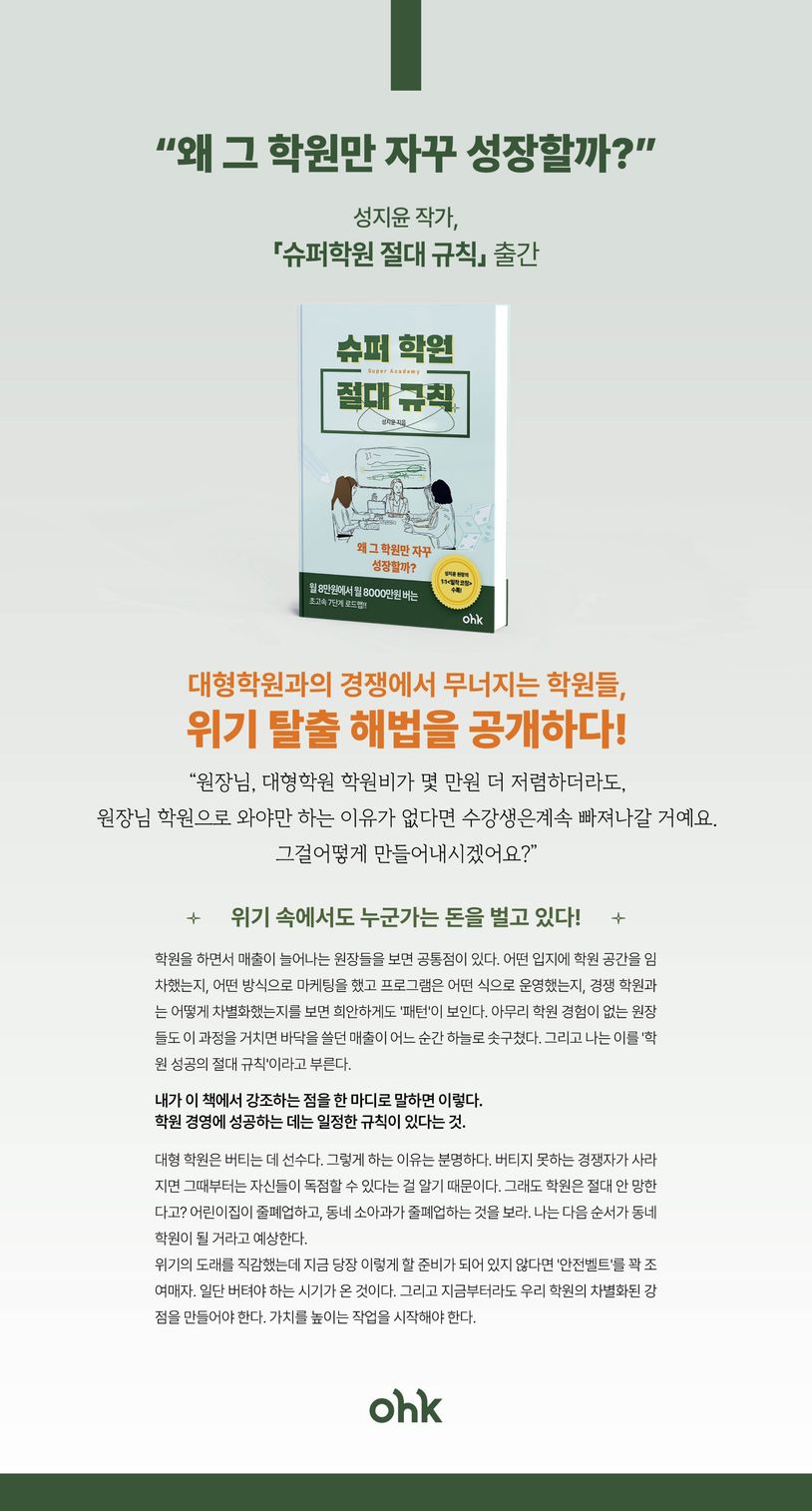 학원을 하면서 매출이 늘어나는 원장들을 보면 공통점이 있다. 어떤 입지에 학원 공간을 임차했는지, 어떤 방식으로 마케팅을 했고 프로그램은 어떤 식으로 운영 했는지, 경쟁 학원과는 어떻게 차별화했는지를 보면 희안하게도 '패턴'이 보인다. 아무리 학원 경험이 없는 원장들도 이 과정을 거치면 바닥을 쓸던 매출이 어느 순간 하늘로 솟구쳤다. 그리고 나는 이를 '학원 성공의 절대 규칙'이라고 부른다.