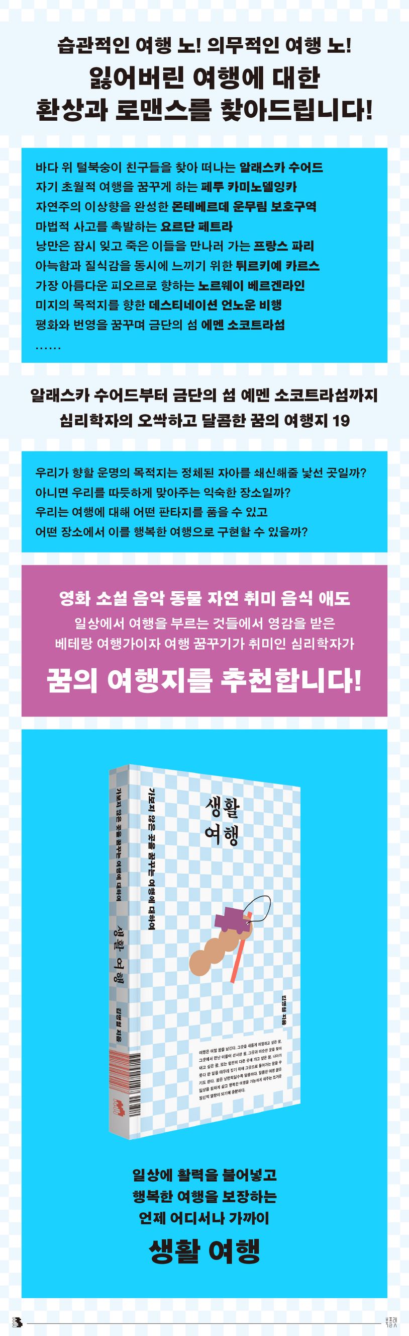 여행은 한때 삶의 전환점이자 설렘의 상징이었지만, 이제는 수많은 여가 활동 중 하나가 되었다. 약간의 시간만 들이면 세계 각지의 비행기 티켓과 숙소를 예약할 수 있고 각종 여행지에 대한 정보와 영상 콘텐츠도 손쉽게 얻을 수 있는 시대에 우리에게 여행은 어떤 의미가 있을까? 이 책은 이러한 시대적 변화 속에서 다음의 질문으로 시작한다. “우리가 향할 운명의 목적지는 정체된 자아를 흔들어줄 낯선 곳일까, 아니면 우리를 따뜻하게 맞아주는 익숙한 장소일까? 우리는 여행에 어떤 판타지를 품을 수 있고, 또 어떤 장소에서 그 꿈을 실현할 수 있을까?”