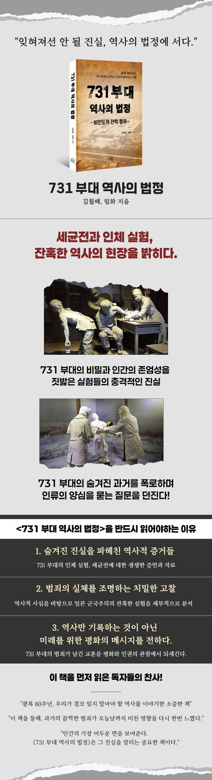 이시이 부대 또는 731부대로 불리는 일본 군국주의 만행은 ‘살인공장’, ‘악마의 포식자’, ‘세균전 부대’, ‘마루타’, ‘생체실험’ 등 다양한 호칭으로 불린다. 인간의 양심과 본질에 정면 도전한 행위이다. 저자들은 광복 80주년을 맞이하여 731 부대와 731 진열관을 기록하였다. 이 책에는 새로운 사실과 사료가 소개되어 있다.