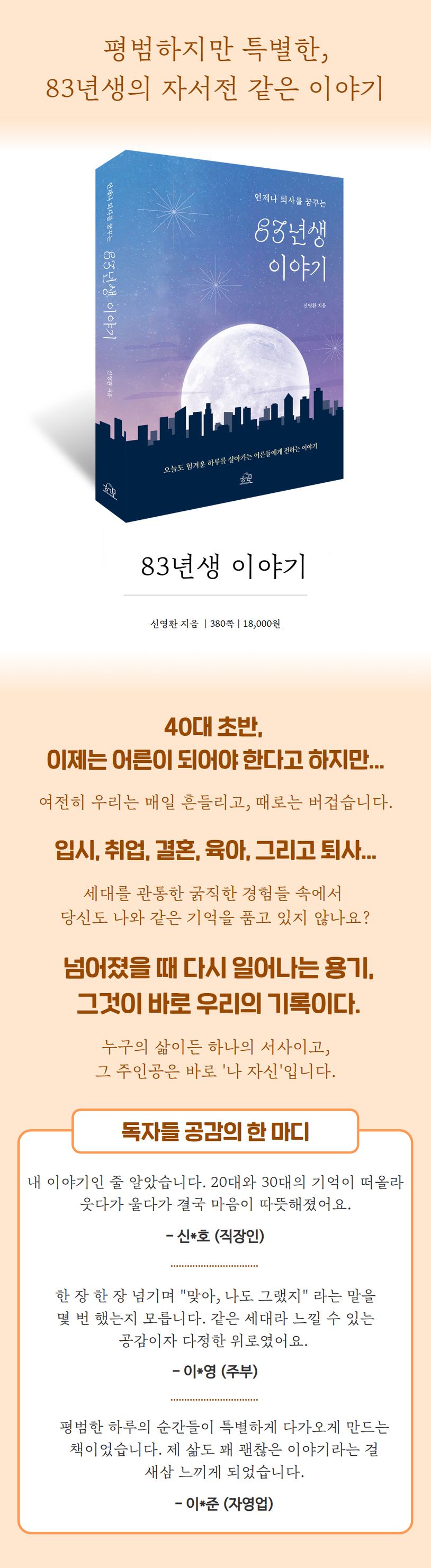 《83년생 이야기》는 독특하게도 한 개인의 이야기가 동시대를 살아온 수많은 사람들의 공감과 기억으로 확장됩니다. 마치 우리 모두의 젊은 날을 함께 기록한 듯한 친숙함과 위로를 느끼게 하는, 바로 '우리 모두의 자서전'입니다.