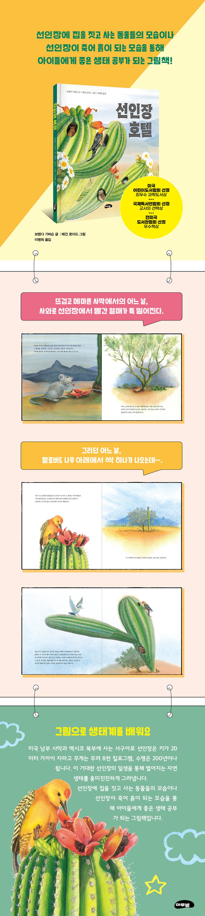 선인장에 집을 짓고 사는 동물들의 모습이나 선인장이 죽어 흙이 되는 모습을 통해 아이들에게 좋은 생태 공부가 되는 그림책입니다.