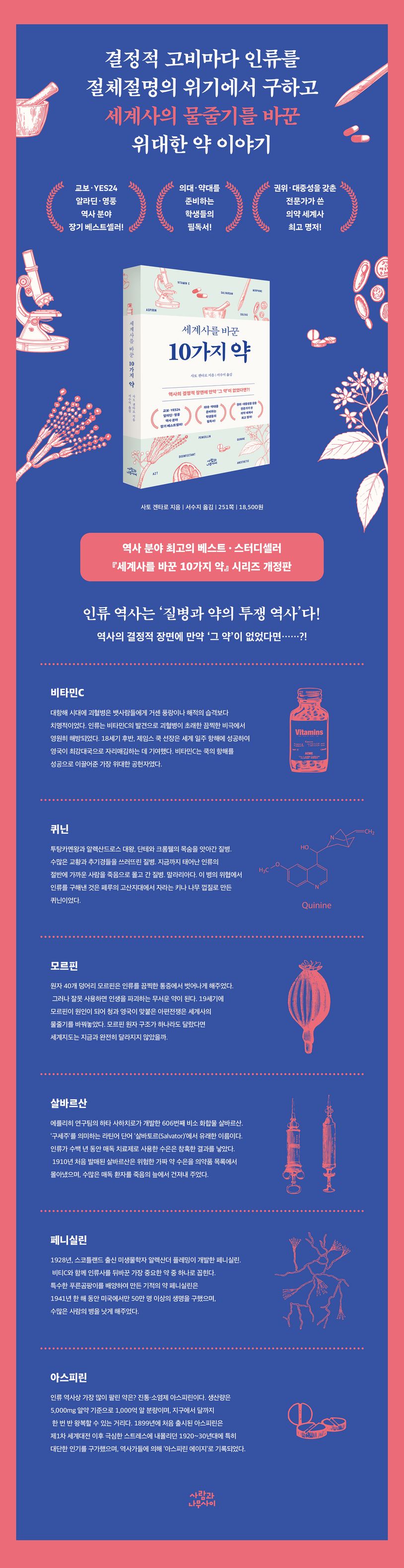 『세계사를 바꾼 10가지 약』은 인류 역사를 ‘질병’이라는 창과 ‘약’이라는 방패의 투쟁 역사로 파악한다. 이 책은 많은 국가와 사회를 치명적 위기에 빠뜨렸던 10가지 질병과 결정적 고비마다 인류를 무서운 질병의 위협에서 구한 10가지 약에 관한 흥미진진하고도 유익한 이야기로 빼곡하다.