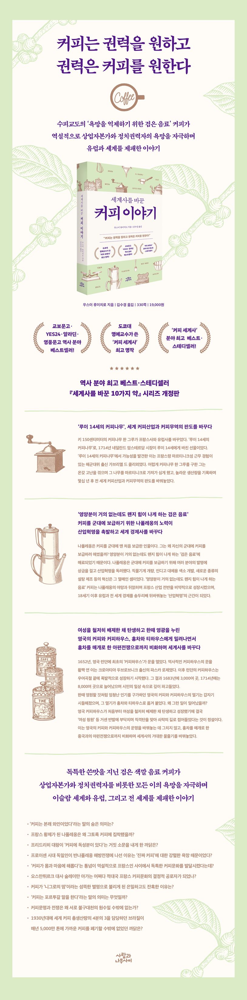 커피는 어떻게 세계사를 바꿨을까? 이 책은 ‘커피와 커피하우스가 없었다면 프랑스대혁명도 일어나지 않았을 것이다?!’, ‘영국에서 커피가 홍차에게 밀려난 원인이 여성을 배제했기 때문이라고?’, ‘세계사의 흐름을 바꾼 독일혁명의 트리거를 당긴 것이 커피였다는데?’ 등 이슬람 수피교도가 욕망을 억제하기 위한 도구로 마시던 ‘검은 음료’가 역설적으로 상업자본가와 정치권력자의 ‘검은 욕망’을 자극하며 아라비아와 유럽, 나아가 전 세계를 제패한 이야기를 다룬다.