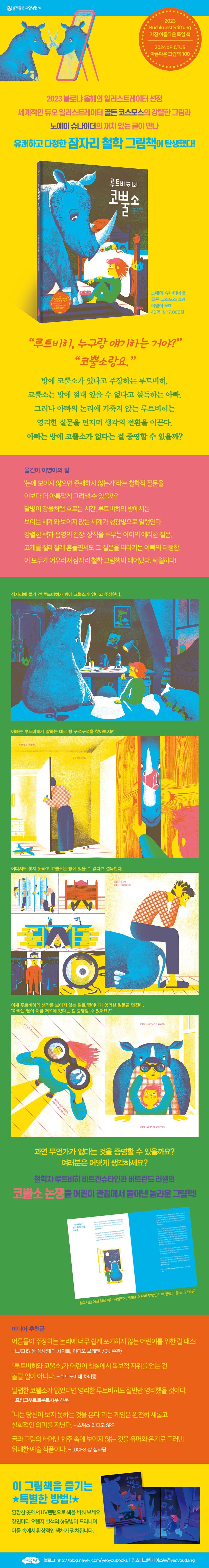 '눈에 보이지 않으면 존재하지 않는가' '어떤 것이 없다는 것을 증명할 수 있는가'라는 철학적 질문을 다룬 이 책은, 철학자 루트비히 비트겐슈타인과 스승 버트런드 러셀의 이른바 '코뿔소 논쟁'을 부자간의 재치 있는 대화와 강렬한 그림으로 펼쳐내고 있다. 둘의 대화를 읽는 내내 어린이 독자들은 루트비히의 재치에 찬사를 보내고, 옷장, 침대 아래, 책상 밑, 천장 등에 날렵하게 숨어 버려 아빠는 보지 못하는 코뿔소를 찾아내는 쾌감을 만끽하게 될 것이다.