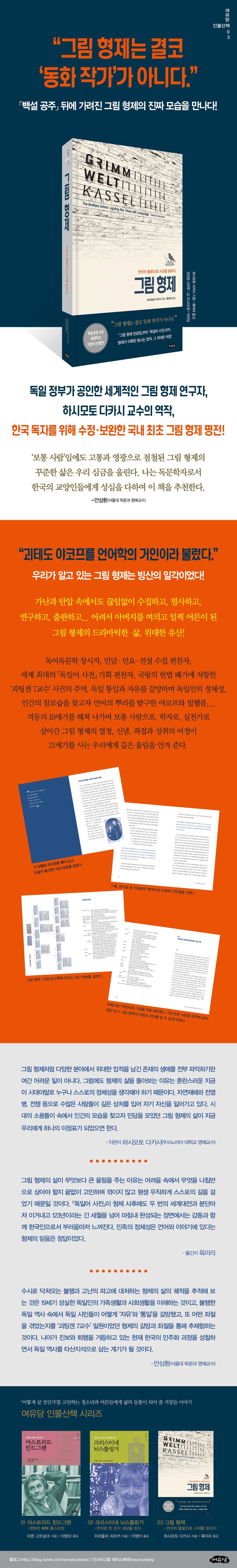 성경 다음으로 가장 많이 번역되고 가장 많이 읽힌다는 『그림 민담집』. 시대와 세대를 넘어 전 세계 어린이와 어른들이 사랑하는 이야기 「백설 공주」 「헨젤과 그레텔」 「라푼젤」 「브레멘 음악대」…. 그러나 우리는 정작 그 이야기를 모으고 편찬한 야코프와 빌헬름 그림에 대해 얼마나 알고 있을까? 여유당 인물산책 시리즈 셋째 권 『그림 형제-언어의 불꽃으로 시대를 밝히다』는 그림 형제를 단순한 ‘그림 동화’ 작가라는 프레임에서 해방시켜, 형제가 이룩한 거대한 업적과 그들의 열정과 신념, 좌절과 성취를 입체적으로 조명한 국내 최초 본격 평전이다.