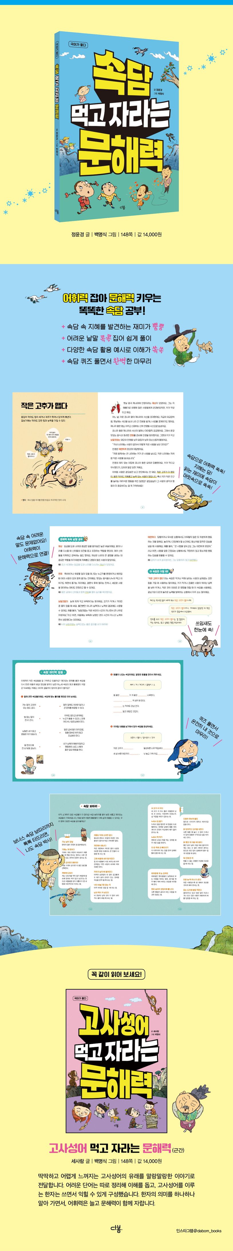 줄임말과 짧은 영상에는 익숙하지만, 기본 어휘를 이해하고 사용하는 데 어려움을 겪는 요즘 아이들. 단어의 뜻을 정확하게 파악하는 힘은 책을 읽고 세상을 이해하며, 생각을 표현하는 데 꼭 필요하며, 문해력 향상과도 떼려야 뗄 수 없습니다. 《속담 먹고 자라는 문해력》은 교과서와 학습지에 자주 등장하는 속담의 의미와 지혜를 이야기로 재미있게 풀어서 웃으면서 읽는 사이에 자연스럽게 어휘력과 문해력을 키울 수 있도록 구성했습니다. 딱딱한 국어 공부 대신, 유쾌한 속담 여행으로 생각하는 힘과 글쓰기 실력까지 길러 보세요.