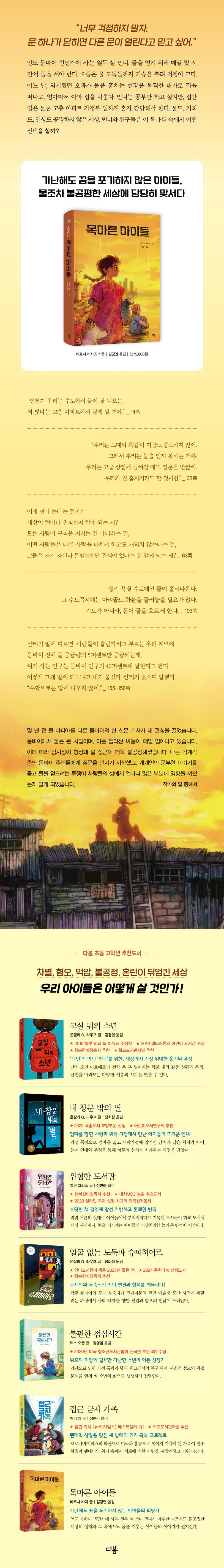 《목마른 아이들》은 우리가 놓치기 쉬운 불평등의 실체를 보여 준다. 빈민가의 물 부족 문제를 배경으로 가난, 교육 기회의 단절, 어린이 노동, 빈부 격차와 같은 사회의 구조적인 문제들을 생생하게 드러낸다. 하지만 고통에 머물지 않는다. 어려운 상황을 맞닥뜨릴 때마다 주저앉지 않고 스스로 질문을 던지고 돌파해 나가는 민니와 친구들, 이웃의 다정한 어른들이 목마름을 해소해 준다.