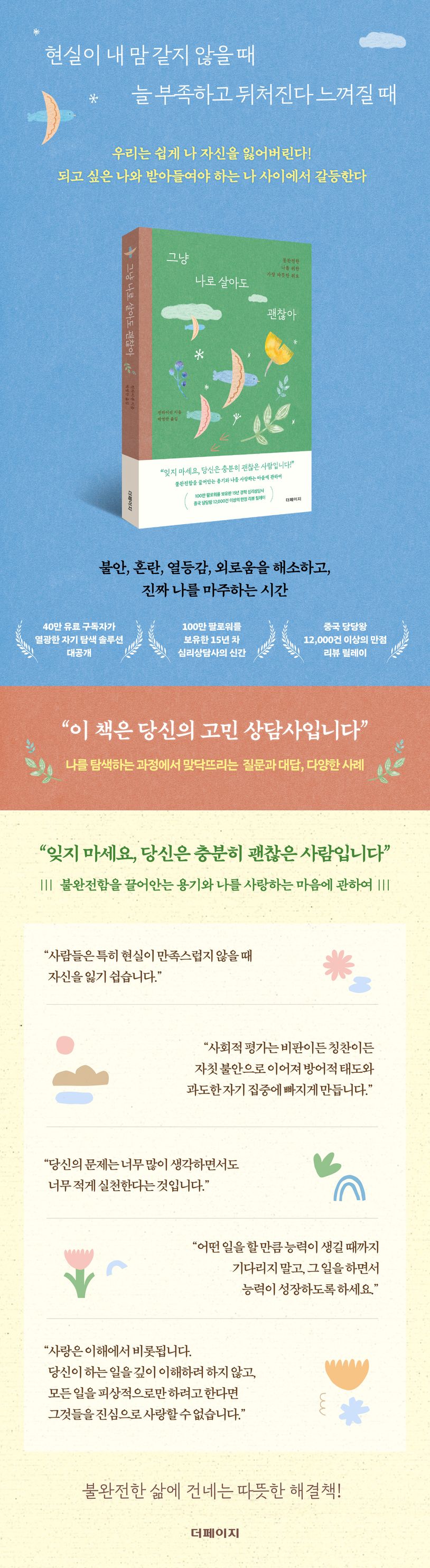 행복은 나를 채찍질하는 데서 오는 것이 아니라, 나를 있는 그대로 받아들이는 과정에서 피어난다. 마치 산을 오르는 것과 같다. 정상에 서는 순간은 짧지만, 오르는 길 자체가 의미 있는 여정이 된다. 이 책은 그 길에서 당신의 동행자가 되어 줄 것이다. 때로는 든든한 조언자로, 때로는 함께 걸어가는 친구로. 당신이 마침내 자기 자신을 찾고, 진짜 행복을 발견하는 순간까지!