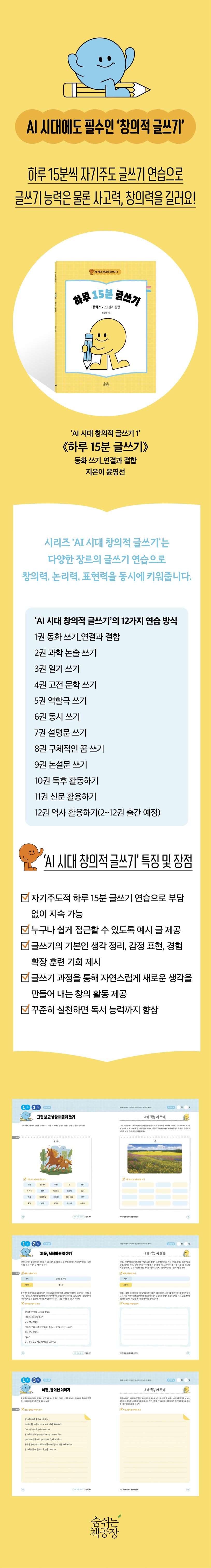 시리즈 ‘AI 시대 창의적 글쓰기’는 1권 동화 쓰기, 2권 과학 논술 쓰기, 3권 일기 쓰기, 4권 고전 문학 쓰기, 5권 역할극 쓰기, 6권, 동시 쓰기, 7권 설명문 쓰기, 8권 구체적인 꿈 쓰기, 9권 논설문 쓰기, 10권 독후 활동하기, 11권 신문 활용하기, 12권 역사 활용하기로 꾸며져요.(2~12권 출간 예정) 각 권은 한 달 동안 하루 15분씩 연습할 수 있도록 구성되어 있어요. 책에 담긴 ‘예시 글’은 어린이와 학생, 초보 글쓰기 학습자들도 체계적이며 어렵지 않게 글쓰기 능력을 기를 수 있도록 해요.