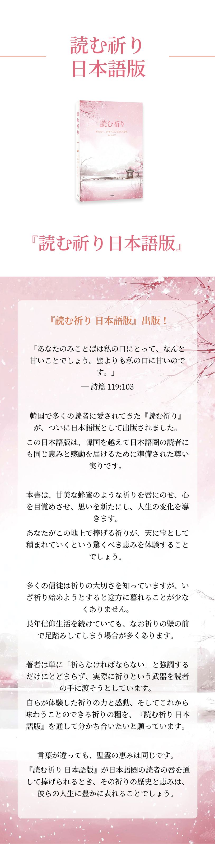 『읽는 기도 일본어판』이 일본어권 독자들의 입술을 통해 드려질 때, 그 기도의 역사와 은혜가 그들의 삶 가운데 풍성히 일어나게 될 것입니다.