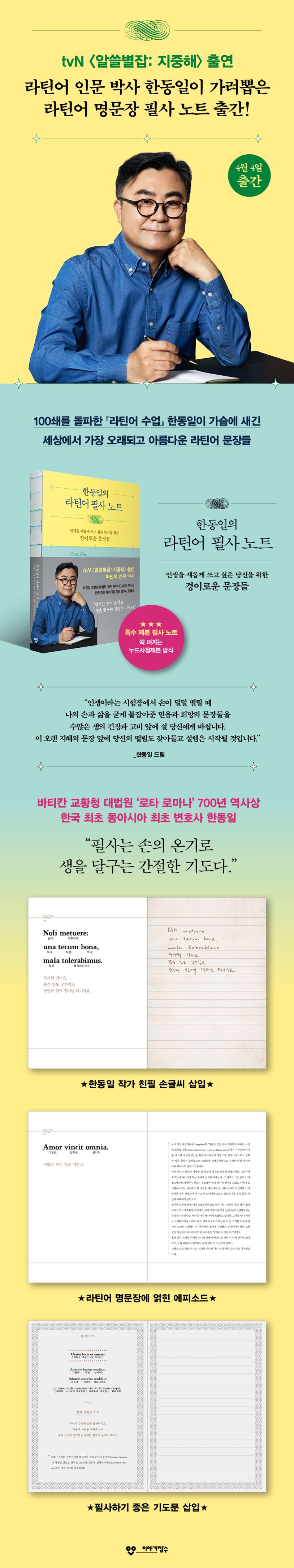 고대 로마인들의 지혜로부터 고립된 수도자가 세상의 경계와 압력을 깨뜨린 외침, 거대한 인생의 시름과 고통을 가볍게 비틀어 웃음으로 치환하는 문장에 이르기까지 『한동일의 라틴어 필사 노트』에는 지난한 삶을 단단히 버티게 해주는 철학과 명문장들이 그득하다.
