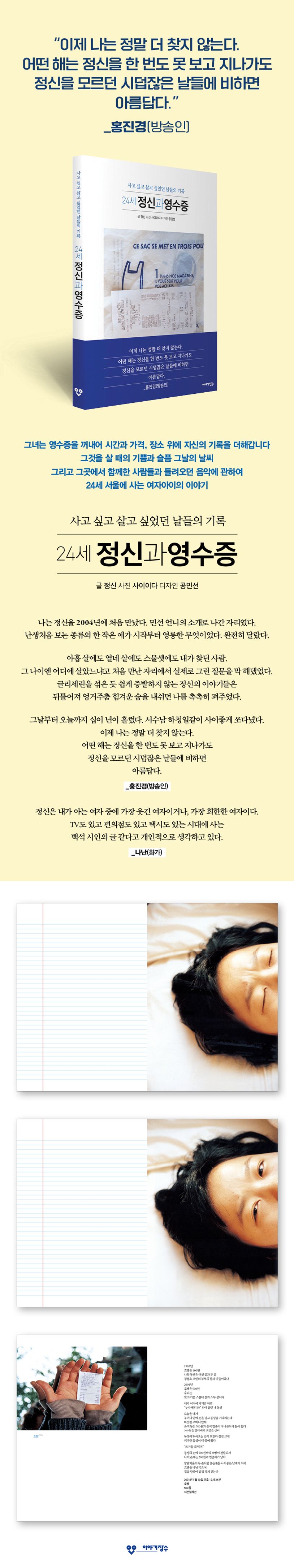 이 책에는 24세 서울에 사는 여자아이의 충만한 감성과 웃음과 울음, 소비와 삶의 궤적이 고스란히 담겨 있다. 작가는 이제 40대가 되어 40세의 소비와 삶을 기록한 신간 『40세 정신과 영수증』을 동시 출간했으나, 24세의 정신은 이 책 안에서 영원히 살아간다.