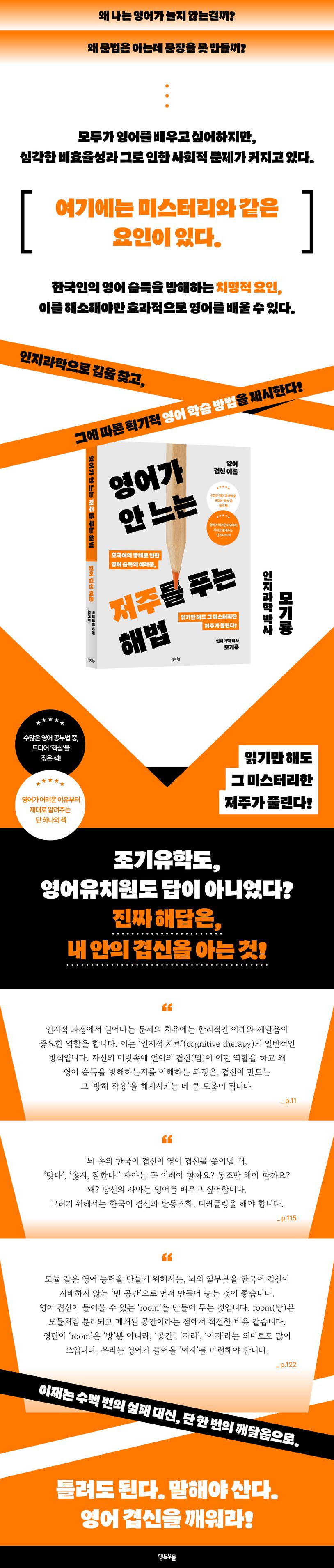 단순히 ‘잘하는 영어’가 아니라, 영어로 사고하고 표현할 수 있는 ‘가능한 영어’의 상태. 〈영어가 안 느는 저주를 푸는 해법〉은 그 가능성을, 그동안 누구도 제대로 짚어주지 않았던 관점에서 새롭게 보여주며, 우리가 왜 영어 앞에서 작아지는지, 그 오래된 수수께끼를 풀어준다. 영어가 막연히 두렵거나, 끝없는 공부에 지쳐버린 누군가에게 이 책은, 생각의 전환이자 새로운 시작점이 되어줄 것이다.
