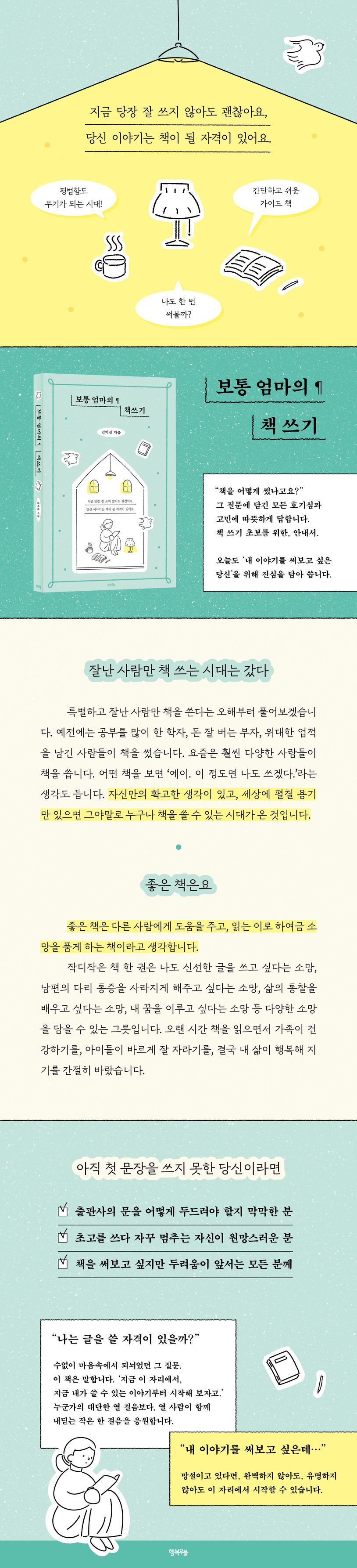 『보통 엄마의 책쓰기』는 오늘도 누군가의 ‘보통’에서 시작될 기적을 응원하는 책이다.