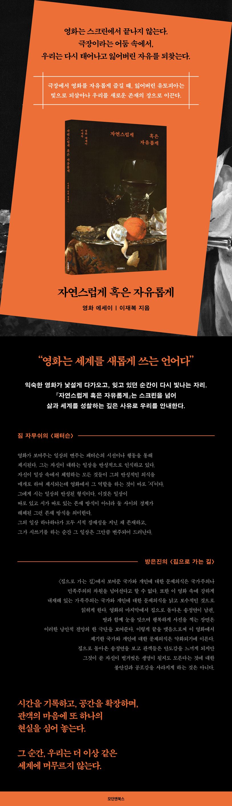 문학평론가이자 K 미학 연구자로 활동하고 있는 이재복 한양대 교수의 영화 에세이 『자연스럽게 혹은 자유롭게』가 모던앤북스에서 출간되었다. 『자연스럽게 혹은 자유롭게』는 「아바타」, 「메트릭스」, 「공각기동대」에서부터 홍상수 감독의 「지금은맞고그때는틀리다」, 「돼지가 우물에 빠진 날」 까지 다양한 층위의 영화를 깊이 있게, 그리고 삶과 세계를 성찰하는 창으로 바라본 책이다. 저자는 대중적으로 성공을 거둔 영화들 뿐만아니라 그렇지 않더라도 내면의 울림을 주는 영화들을 선별하여 특유의 논리적인 분석과 철학적 사유를 통해 새롭게 들여다본다. 특히, 영화의 주제와 소재에 따라서 미학의 기본 원리 중 하나인 ‘일상을 낯설게 하기’ 가 영화 안에서 어떻게 상투성에 대한 파괴 및 해체가 이루어지는 지에 대한 힌트를 주기도 하며(짐 자무쉬의 「페터슨」), 몸과 영혼, 가상세계와 디지털테크놀로지 등을 넘나들며 테크놀로지와 자연, 비트(bit)와 기(氣)를 대비시키며 우리 몸이 어떻게 디지털 생태계와 에코 생태계에서 존재하게 되는 지(오시이 마모루의 「공각기동대와」워쇼스키 자매의「매트릭스」)에 대한 분석을 담담하면서도 유려한 문체와 함께 풀어낸다. 문학평론가이면서 또한 ‘몸의 에티카(ETHICA)’를 정립하고 연구하는 학자로서 그가 영화를 통해 해석해내는 세계는 남다른 깊이가 있다. 예컨대, “디지털 테크놀로지는 비트(bit)의 조합이고, 자연이나 생명은 기(氣)의 총합이다. 우연인지 혹은 필연인지는 모르지만 비트와 기 모두 눈에 보이지 않는 에너지의 흐름을 지니고 있다. 하지만 비트는 세계와의 불연속성, 기는 연속성을 드러내면서 각각 디지털 생태계와 에코 생태계를 이룬다. 우리의 몸은 이 두 생태계 속에서 삶을 영위하고 있다.”라는 대목에서 우리는 영화 속에서 영화 밖을 해석해 낼 수 있는 신비로운 경험을 하게 된다. 상당수는 우리에게 익숙한 영화이지만, 저자의 글은 그 영화들의 여운을 확장시키고 때로는 전복시키며 사유의 새로운 지평을 열어준다. 바로 그 순간, 우리는 잊고 있던 영화 속 한 장면이나 일상의 한 순간에서 새로움을 발견할 수 있는 힘을 얻게 되며, 그렇기에 저자의 글와 문장 하나하나는 더욱 소중해진다. 영화를 이미 보았어도, 혹은 보지 않았더라도 관계없이, 『자연스럽게 혹은 자유롭게』의 책장을 넘기다보면 독자들은 우리가 속한 세계와 그 이면을 바라보는 시야가 ‘자연스럽게 혹은 자유롭게‘ 확장되어 새로운 빛으로 탄생하는 마법을 경험하게 될 것이다.