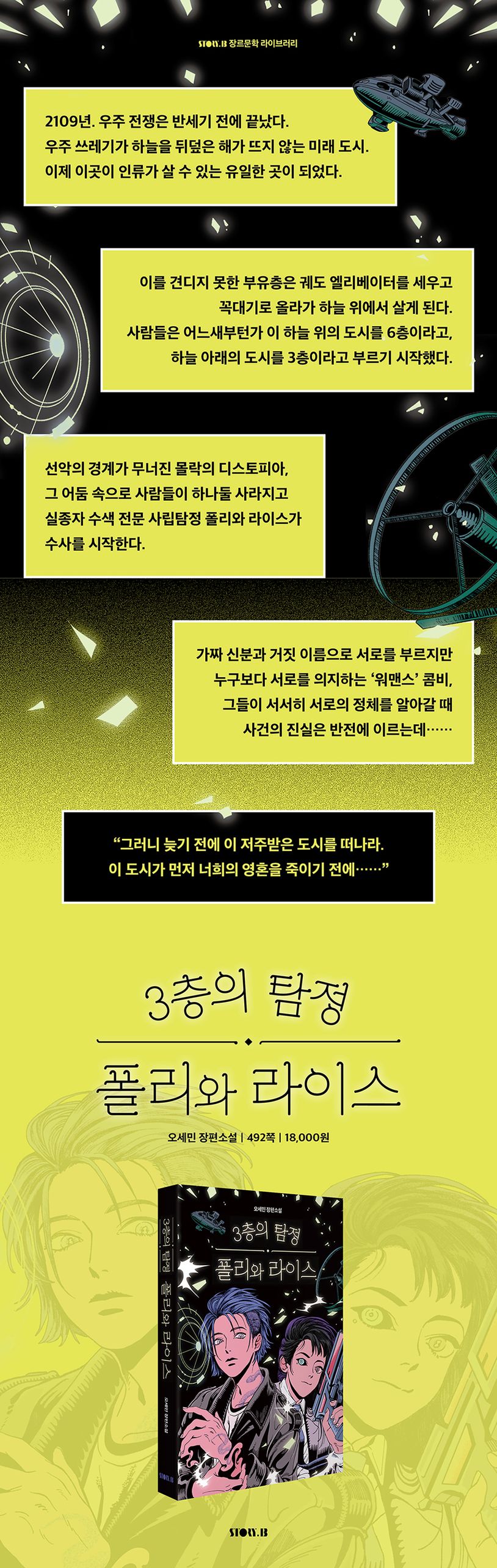 2109년. 우주 전쟁은 반세기 전에 끝났다. 우주 쓰레기가 하늘을 뒤덮은 해가 뜨지 않는 미래 도시. 이제 이곳이 인류가 살 수 있는 유일한 곳이 되었다. 이를 견디지 못한 부유층은 궤도 엘리베이터를 세우고 꼭대기로 올라가 하늘 위에서 살게 된다. 사람들은 어느새부턴가 이 하늘 위의 도시를 6층이라고, 하늘 아래의 도시를 3층이라고 부르기 시작했다.
