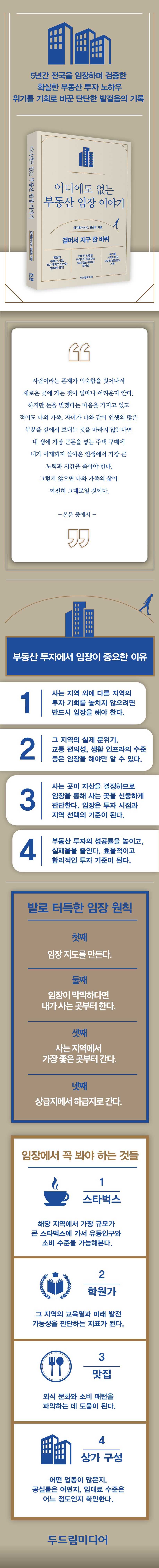 프롤로그5PART1부동산투자에서임장이왜중요한가?13태어나서자란지역의한계18사는곳이자산의크기가된다24안가보면모른다28부동산은큰돈을넣는것이다50PART2어떻게임장하는가?61임장지도를짜보자661.호갱노노를열자72|2.카카오맵을열자75|3.가격의방향대로움직이면된다77|4.백화점과학원가를보자79임장하기가막막하다면내가사는곳부터84좋은곳에서나쁜곳으로93사는지역에서가장좋은곳부터가자96PART3실전임장105도보로,차로,대중교통으로임장하는방법1101.도보로임장하는방법110|2.차로임장하는방법126|3.대중교통을이용해서임장하는방법134임장에서꼭봐야하는것1381.그동네의제일큰스타벅스에가봐라139|2.학원가를꼭가봐라143|3.맛집을가보자148|4.상가의구성을보자153임장을효율적으로하는법1571.규칙적인임장시간을습관으로만들어야한다157|2.다양한부동산유튜브채널보기163|3.임장할때가격보지않기166|4.시작점과마무리지점을잘잡아야한다168I5.교통량을확인해라170지역마다임장하는방법이다르다175임장을하고난다음의복기과정181임장이벽으로느껴질때마다193부동산중개사무소방문은이렇게하라198PART4임장으로얻을수있는것203결국돈을벌기위한것207아는만큼보인다213지역간의비교하는방법218부동산투자에있어서효율적인독서법226누구나할수있지만아무나할수없다231부록서울임장리포트234에필로그246